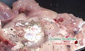 На сковороду викладаємо шматочки м’яса. Солимо і перчимо. Закриваємо кришкою. Готуємо до напівготовності. Не забуваємо помішувати.