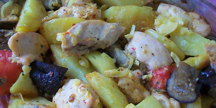 Якщо хочеться соковитості і яскравості, то згодиться курка з картоплею та овочами в духовці. За рахунок додавання різнокольорових помідорів, баклажанів і цибулі страва виходить річним, апетитним і позитивним. Додана до нього суміш спецій з лаврового листа, чорного меленого перцю і чилі робить закуску вишукано гострою, з насиченим пряним ароматом і зігріваючу дію.