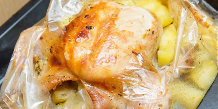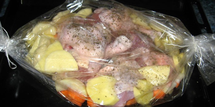 Приготовлена ароматна курка з картоплею в духовці в рукаві відрізняється підвищеною соковитістю і м’якістю завдяки впливу пари. Вона просочується усіма соками і ароматами доданих спецій, тому виходить ніжною і гладенькою. Добре поєднувати м’ясо з сумішшю спецій хмелі-сунелі, яка збагатить смак, додасть йому легку гостроту і пікантність.