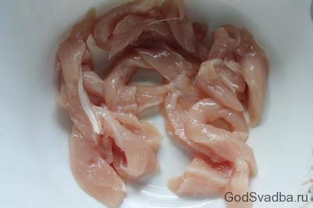 - Куряче філе зрізати з кістки і розділити ножем на тонкі смужки. Шкіра для готування не знадобиться, тому її також видаляємо.