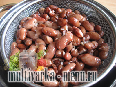 Квасоля добряче промиємо в холодній воді і відправимо в ємність мультиварки. Додамо туди воду. Відваримо її в режимі «варити до готовності. Час приготування квасолі залежить від її сорту. Попередньо бажано замочити квасолю на ніч, тоді вона звариться значно швидше.