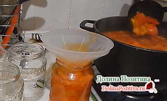 • Додаємо перчики. Знову чекаємо, коли маса закипить. Після чого варимо ще 15 хвилин. Приступаємо до завершальної стадії — закриваємо банки.