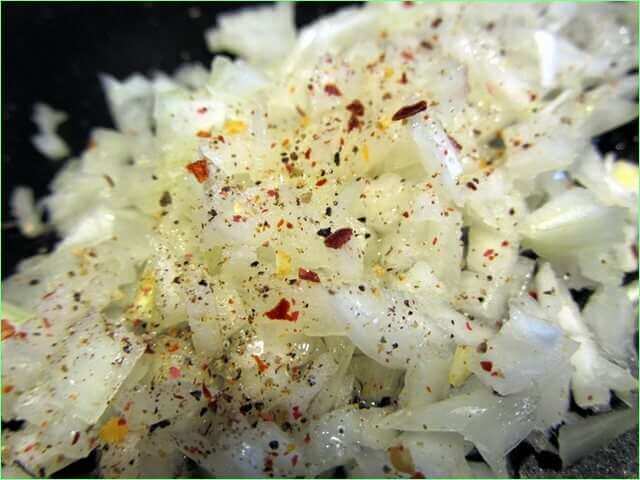 Дрібно шаткуємо цибулю і капусту. Змішуємо м’ясний фарш, цибулю, капусту, остиглий рис і яйце. Додаємо за смаком перець, сіль, приправи. Отриманий фарш прибираємо в холодильник.