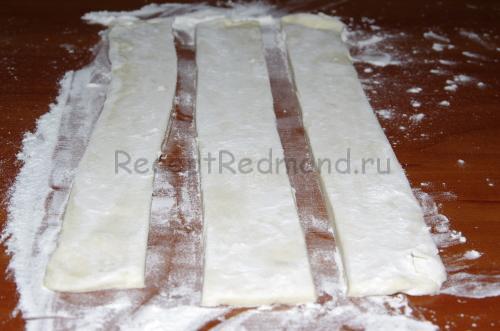 Розморожене тісто наріжте на смужки 15*3 див. Сильно розкочувати їх не потрібно, так як тоді вони будуть гірше згортатися.
