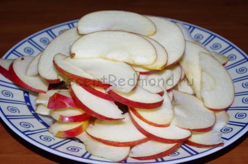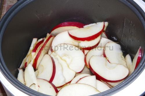 Розведіть в половині склянки води, цукор і на режимі випічка доведіть до кипіння суміш. У вас повинна вийде карамель куди і відправляються яблука на кілька хвилин для розм’якшення. Довго варити яблука протипоказано, вони повинні стати еластичним і відразу ж їх потрібно вийняти на тарілку.