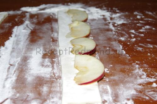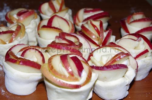 Викладіть на тісто охолоджені яблука, так, щоб вони виступали за край на 13. На одну троянду у мене йшло 5 часточок яблук. Можна посипати яблука додатково до ванілі ще і корицею. Тоді аромат буде ще краще, але слід пам’ятати, що вся начинка буде прагнути вниз і існує можливість пригорання денця (особливо, якщо ви вирішите покласти в середину ще й цукор). Для тих, хто сильно солодке не дуже любить — листкові «Троянди», посипані тільки ваніллю і цукровою пудрою, оптимальний варіант.