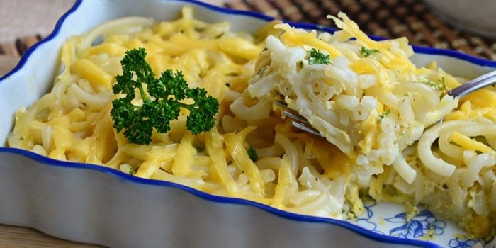 Це відмінний і простий дієтичний обід, оскільки складні вуглеводи, представлені пастою, скомбіновані з овочами. Сирна шапочка тонка, тому високою жирністю макарони запечені в духовці не володіють. Намагайтеся використовувати тільки легкі, водянисті овочі: кабачки, помідори, або ж будь-які види капусти – так запіканка з макаронів з сиром вийде низькокалорійної.