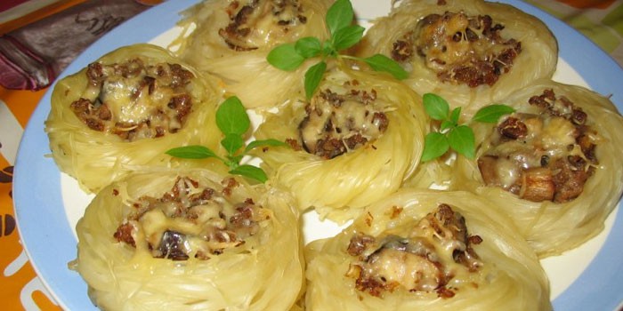 Дане блюдо – відмінний варіант для романтичної вечері, доповненого червоним сухим вином. Красиві макарони гнізда з фаршем в духовці – смачно, швидко, просто. Якщо вам не вдалося знайти правильну готову форму (тальятеле), ви можете відварити спагеті, поділити їх на кілька частин, кожну скрутити клубочком і використовувати аналогічно на деку.