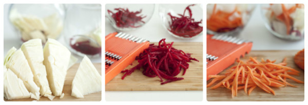 Очищену буряк і моркву подрібнюємо на тертці. Можна використовувати спеціальне пристосування – тертці для корейських салатів.