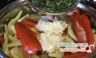 З’єднайте овочі з часниковою масою і зеленню, перекладаємо все в каструлю. Додаємо спеції, олія. Гарненько перемішуємо і залишаємо на 60 хвилин.