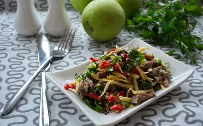 Давним-давно моя бабуся, яка відпочивала у грузинському курортному містечку Цхалтубо, привезла звідти мішечок місцевої приправи з химерною назвою, кілька стручків пекучого перцю і приголомшливий рецепт м’ясного салату – класичного і в той же час оригінального, з виразною кавказької нотою. З тих пір він – «родзинка» нашого зимового меню і незмінний хіт багатьох домашніх застіль.