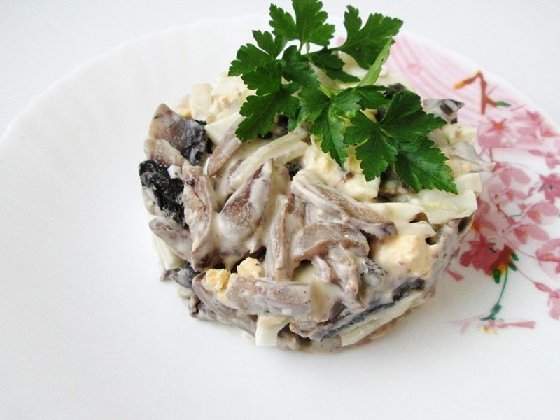 М’ясо і гриби можна використовувати не тільки для приготування другої страви, але і для апетитних і ситних салатів. Наприклад, для простого і швидкого рецепта знадобиться: