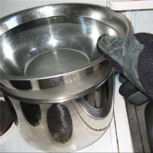 Як робити: на дно великої каструлі ставлять підставку, наливають напівфабрикат не вище підставки, встановлюють маленьку каструльку по центру. Сковороду прилаштовують на отриману конструкцію. Місця зіткнення ущільнюють мокрим рушником (тістом, хлібним м’якушкою), щоб не виходив пар. Потім нагрівають це на маленькому вогні. У сковороді потрібно періодично міняти гарячу воду на холодну.