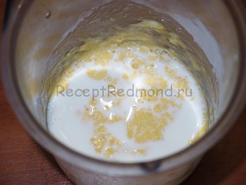 Змішайте яйце, борошно, крохмаль і цукор в однорідну суміш. Додайте трохи молока, щоб маса була як на рідкі оладки. Я завжди беру крохмаль для заварного крему, тому що тоді він виходить більш ніжної консистенції без грудочок. Якщо раніше ви готували тільки з борошном, спробуйте — і обов’язково зміните переваги.