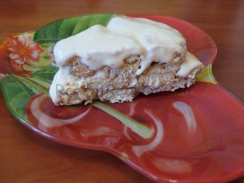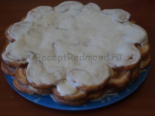 На велике блюдо викладіть одним шаром вушка і заповніть проміжки між печивом. Нижній шар я покрила кремом з одного боку, а наступні просто макала в крем. Не економте його, так як постоявши кілька годин, печиво вбере в себе все. Тому, крім умочування печива в крем, викладіть зверху ще кілька ложок.
