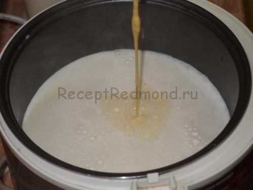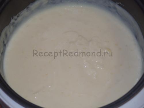 Закип’ятіть молоко на режимі випічка і тонкою цівкою влийте в крохмальну суміш. Безперервно помішуйте крем до повного загустіння. Вимкніть мультиварку і покладіть туди вершкове масло і ванілін.