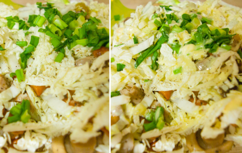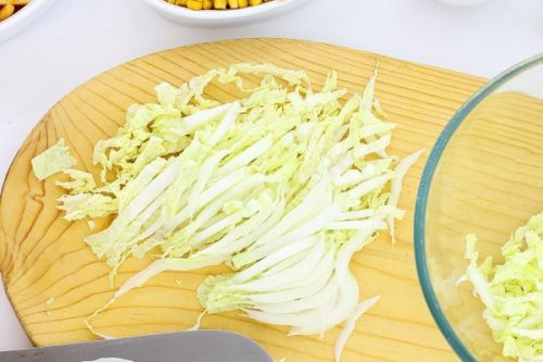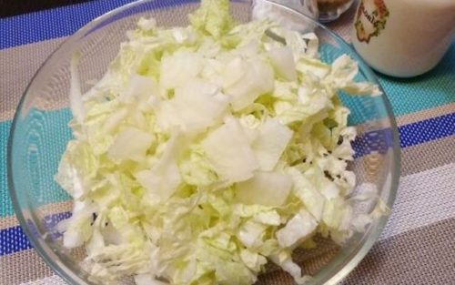 - Пекинку подрібнюємо тоненькою соломкою, цибулю шаткуємо на четвертинки і ошпарюємо окропом, щоб прибрати зайву гіркоту. Але можна просто покришити його дрібними кубиками, так він теж не буде гірчити.