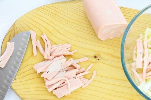 - Китайську капусту, шинку і яєчний млинець ріжемо соломкою.