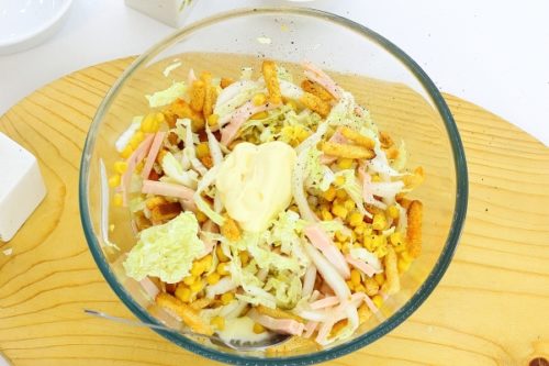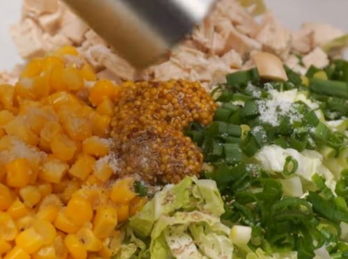 - Всі інгредієнти відправляємо в миску, висипаємо до них кукурудзу, кладемо гірчицю зернами, майонез, сіль і перець, змішуємо.