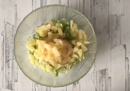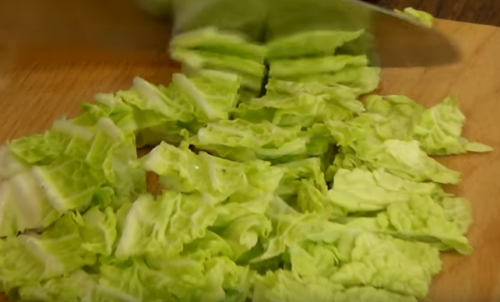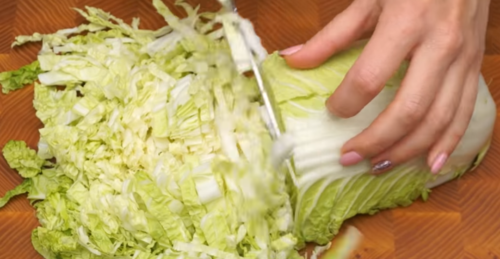 - Невеликими квадратиками китайську капусту шаткуємо.
