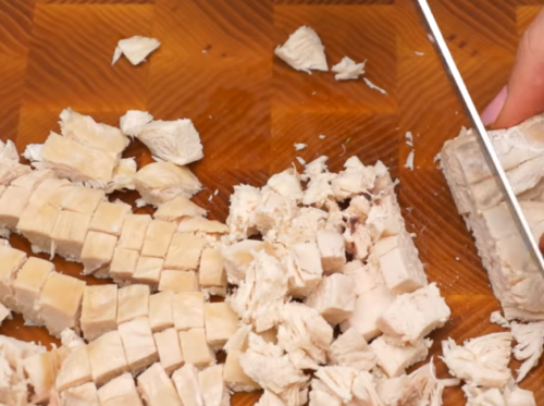 - Філе птиці попередньо відварюємо в підсоленій воді протягом 20-25 хвилин, потім охолоджуємо і поділяємо на волокна.