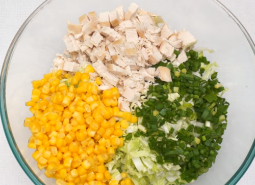 - Всі складові закуски відправляємо в миску, висипаємо до них солодку кукурудзу, а також дрібно посічену зелень кропу і цибулі.