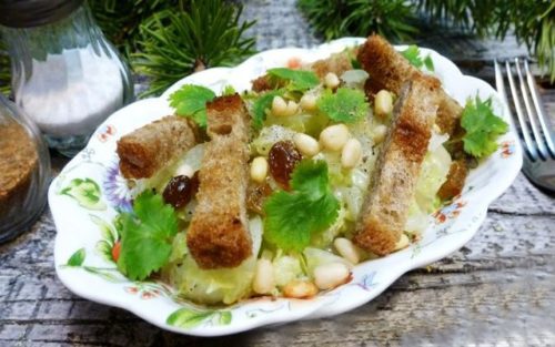 Якщо салат подається не одразу після приготування, то сухарики додавати не варто, тільки перед самою подачею, інакше вони втратять свої смакові якості.