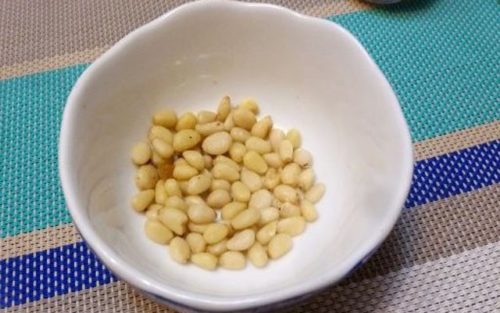 - Очищені плоди кедрових горішків пару хвилин підсушуємо на сухій сковороді і пересипаємо в тарілку.