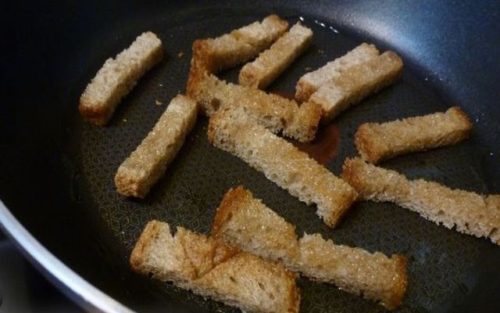 - З шматочків житнього хліба зрізаємо шкірку, м’якоть ділимо на кубики і на окремій сковороді підсушуємо.
