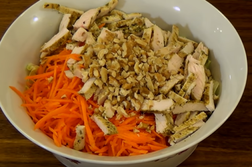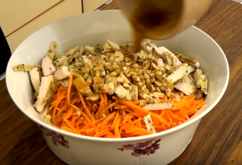- Всі інгредієнти, включаючи гостру моркву, відправляємо в салатник, заправляємо майонезним соусом і перед подачею посипаємо волоськими горішками, які потрібно підсушити і дрібно порубати.