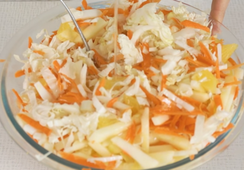Китайська капуста чудово поєднується не тільки з іншими овочами, але і з фруктами, навіть з цитрусовими. Так дуже смачні і легкі салати виходять з пекінської капусти з додаванням апельсина або грейпфрута.