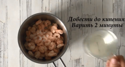 - Креветки засипаємо в киплячу підсолену воду, варимо 2 хвилини і викладаємо на друшляк. Варити морепродукт довго не варто, інакше м’ясо стане гумовим на смак.