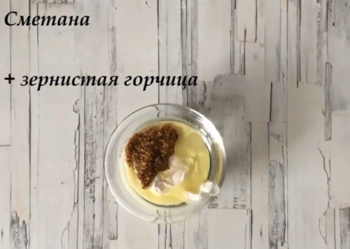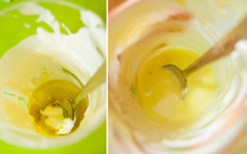 - Для заправки в миску кладемо кисломолочний продукт, вливаємо в нього масло, сік цитруса, кладемо гірчицю і добре все розмішуємо.