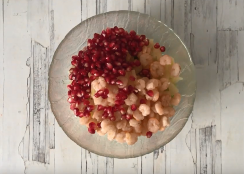 - Гранат розбираємо на зерна, ананас дістаємо їх банки, відкидаємо на друшляк, а потім нарізаємо невеликими шматочками.