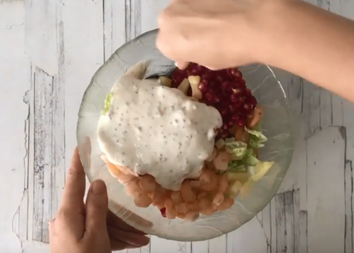 - Отриманим соусом присмачую салат і добре все перемішуємо.