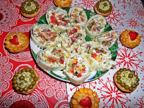 Охолоджений рулет дістаємо, знімаємо плівку, нарізаємо порційними широкими шматочками, кладемо на широке плоске блюдо, прикрашаємо гілочками кропу і подаємо яскраве і оригінальне блюдо до столу.