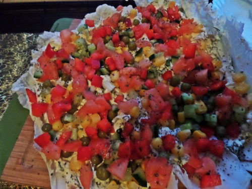 - Отриману сирну масу наносимо на листя капусти, зверху викладаємо дрібно подрібнений огірок, томат, тільки без соку, солодкий перець, кукурудзу і зелені боби.