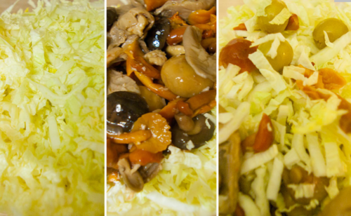 - Оливки і асорті з маринованих грибів звільняємо від розсолу і викладаємо до капусти.