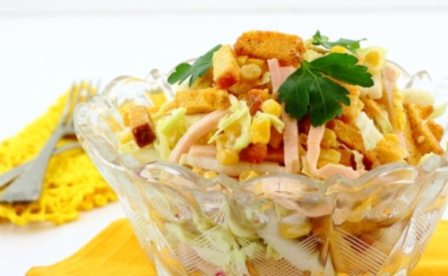 Якщо постало питання – що приготувати на святковий стіл, то можна сміливо готувати салати з пекінської капусти, всі рецепти з фото смачні і прості в приготуванні. Один з варіантів є закуска з шинкою і сухариками, всі інгредієнти для салату прості, а результат приємно порадує всіх гостей.