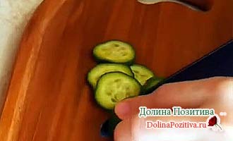 Викладаємо шар свіжого огірка. Зверху відправляємо лосось.