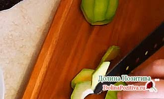 Видаляємо кісточку у авокадо, знімаємо шкірку. Нарізаємо екзотичний фрукт слайсами.