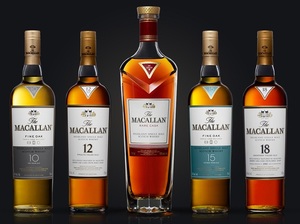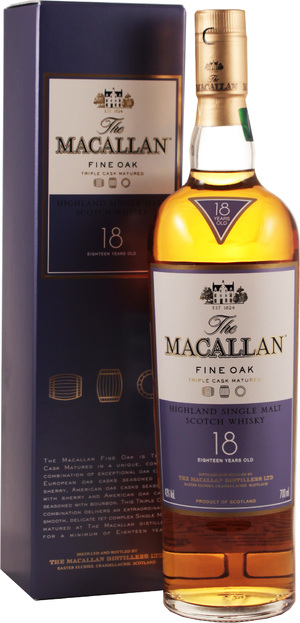 - The Macallan Fine Oak 18. Напій кольору бурштину з золотистим відтінком володіє квітково-фруктовим ароматом, приправленим спеціями, внаслідок зміни бочок під час тривалого періоду витримки. У ньому поєдналося щільний, з м’якими нотками смак цитруса з прянощами, змінюється стійким післясмаком, віддають тропічними фруктами з жасмином.
