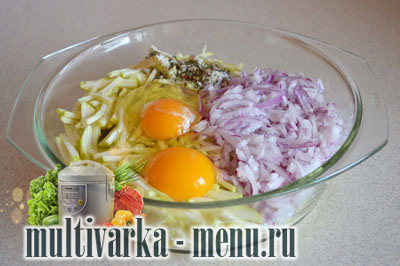 Далі змішуємо натерті кабачки разом з подрібненою цибулею і яйцями. Додаємо сіль і суміш трав.