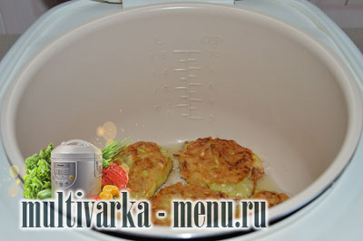 У ємність мультиварки додаємо масло і добре розігріваємо його в режимі «Смаження м’яса». Тісто викладаємо ложкою на дно ємності мультиварки, формуючи акуратні оладки.