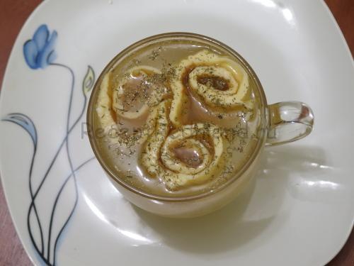 Акуратно викладіть омлет на тарілку і гарячим скрутіть в рулет. Я чекаю, поки він охолоне і тоді ріжу його на тонкі кільця. Але набагато ефектніше омлет в бульйоні виглядає, коли ріжеш його на три частини і щільно укладаєш в бульонной чашці.