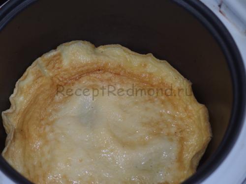 Включіть в мультиварці режим смаження і налийте на дно трохи рослинного масла. Після того, як поверхня чаші нагріється, вилийте яєчну суміш і рівномірно розподіліть її по всій поверхні. Закрийте кришку й почекайте хвилин 10, поки омлет не дійде до кондиції.