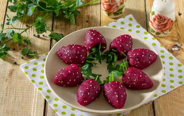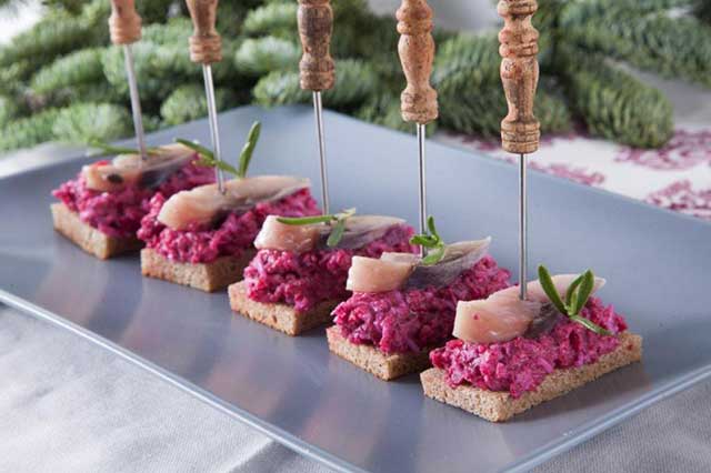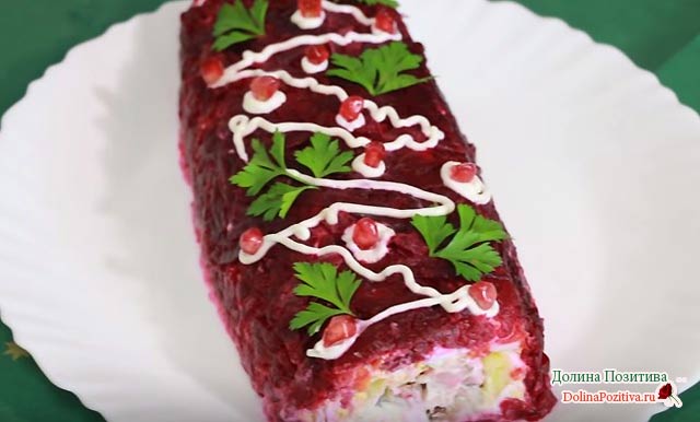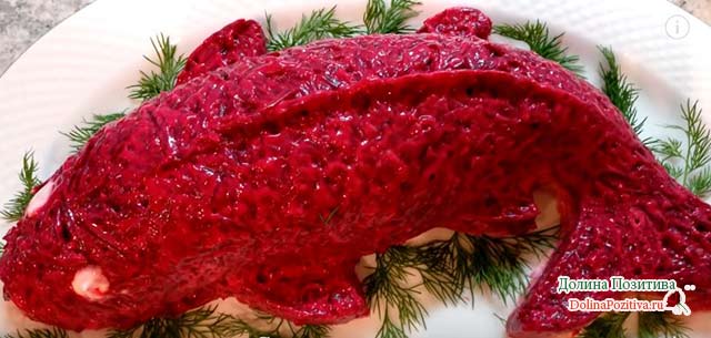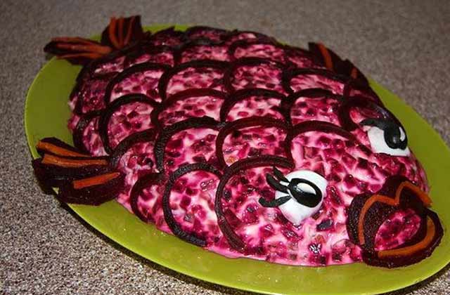 Яскрава бурякова «шуба» готова змагатися з святковим вбранням самого Діда Мороза! Укладіть салат у вигляді рибки, прикрасьте овочевий нарізкою, зеленню, яйцем, консервованою кукурудзою або горошком.