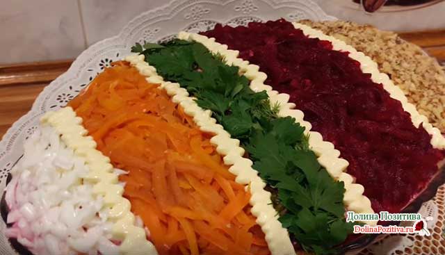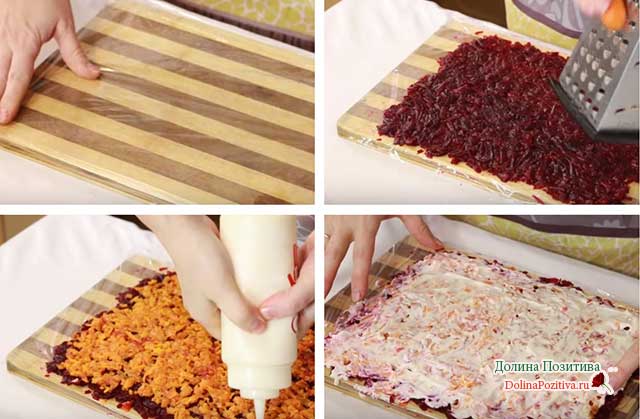 Деякими господинями практикується двошарова збірка салату. Кількість кожного компонента ділиться навпіл, і черговість прошарків повторюється двічі. Блюдо виходить більш соковитим і ситним.
