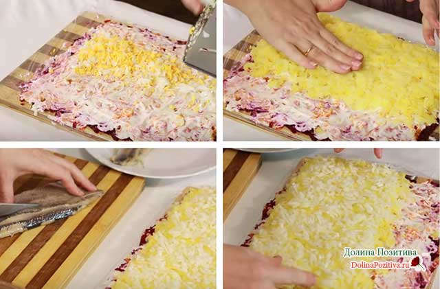 У питанні, як правильно укласти шари, не існує обов’язкових канонів. Хтось кладе на дно рибний шар і вкриває овочевий шубою. Комусь подобається підкладати під оселедець частина вареної картоплі. Рибка з усіх сторін «одягнеться в шубу», і нижній картопляний шар добре просочиться оселедцевим смаком.