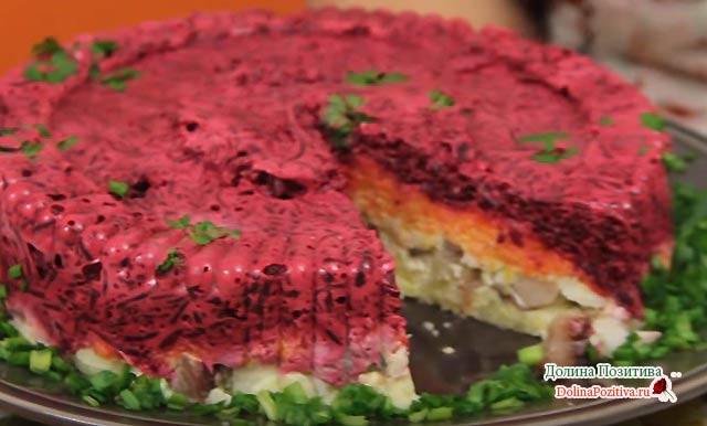Оригінальна трансформація верхнього бурякового шару в овочеве суфле перетворює класичний салат у святковий торт. Замість бісквітів в ньому овочі, роль солодкого крему виконує майонезний соус, а родзинка – ароматна оселедець пряного посолу.
